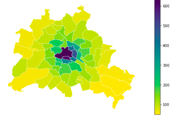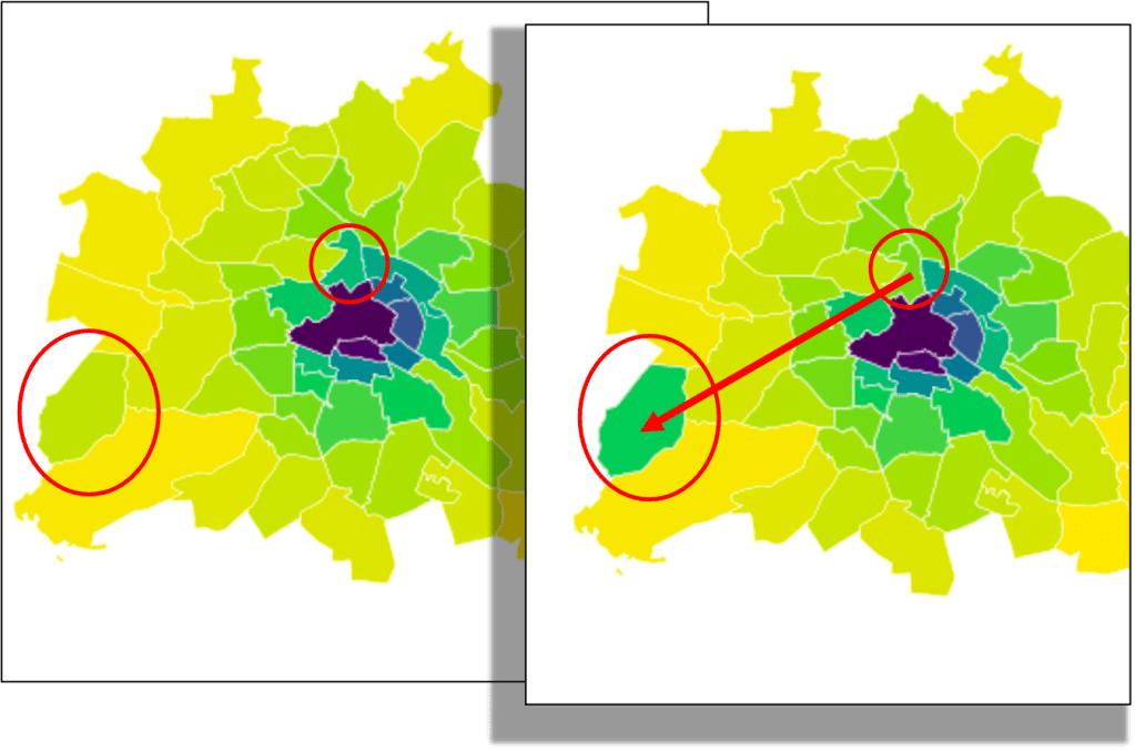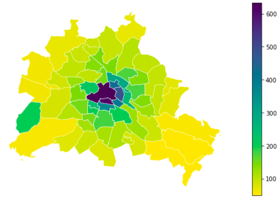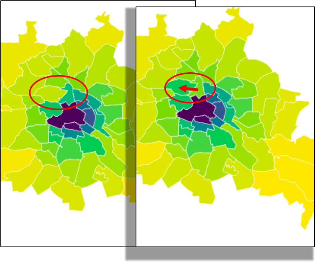 Let’s assume you have a map that shows the distribution of people within Berlin – e.g., data collected through cellular networks, GPS tracking, stationary sensors, or simply a survey. You aggregate the data spatially (in this example we use the “Planungsräume Berlin from the Geoportal Berlin” as a tessellation) and get the following result: