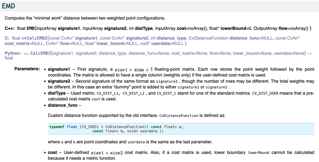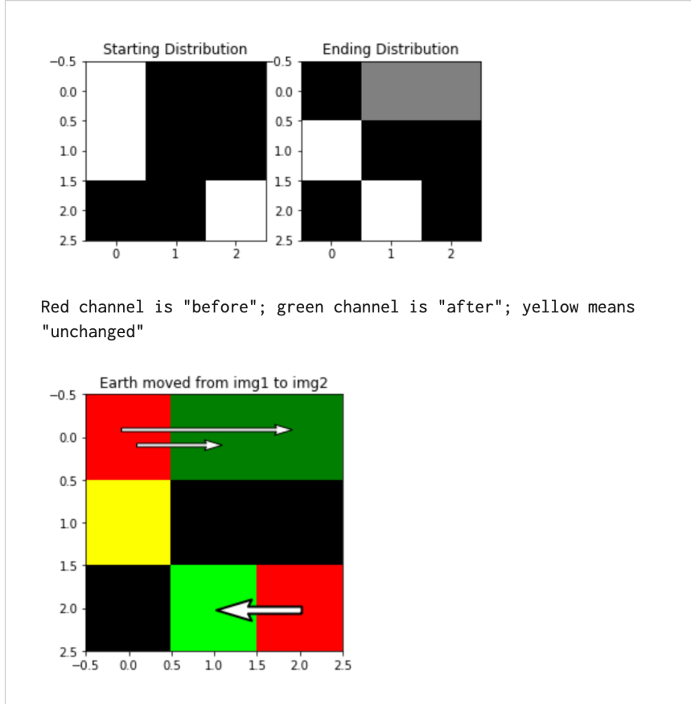 Unfortunately, the documentation is not very intuitive to understand but thankfully there is a blog article by Sam van Kooten who explains this nicely. His illustration also shows visually, how the earth mover’s distance works for images: