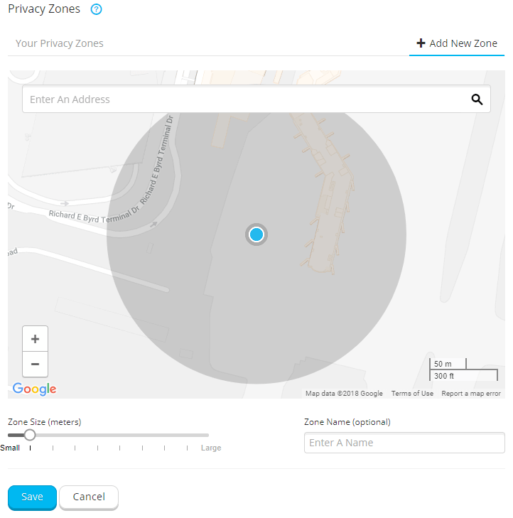To protect sensitive locations such as the home location, some of those sports app providers like Garmin or Strava offer a privacy zone functionality. Users can define sensitive locations around which a privacy zone is created according to a preferred radius (see Figure 1 for an example of the privacy zone user interface by Garmin). Any shared routes will be cut off at the boundary of the privacy zone (see Figure 2).