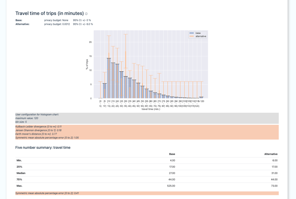- Max. trips per user: To provide differential privacy on a user-level (in contrast to the much weaker guarantee of item-level), noise is calibrated according to the maximum possible contribution a user can make. Intuitively, if 90% of a the dataset consists of trips of a single user, much more noise is needed to ‘hide’ them in the crowd in contrast to a person that is only contributing 1% of the data. This leads to the phenomenon, that only using a sample of the dataset, in comparison to the entire dataset, results in less noise and likely a higher utility (You can find more in-depth information and evaluations on this in our paper.)