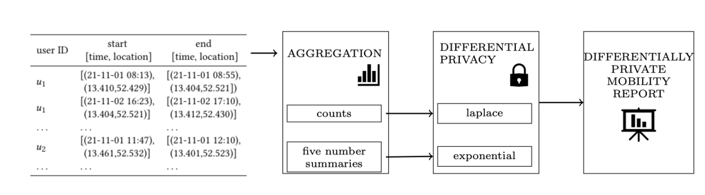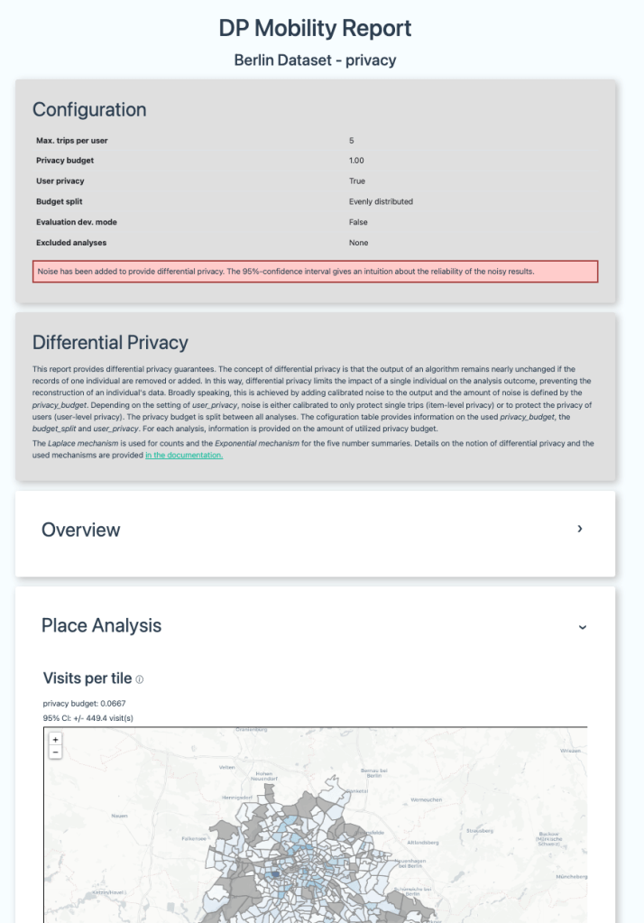 Essentially, the report takes the dataset as input, computes the aggregations and applies noise according to differential privacy and outputs an HTML file with a DP Mobility Report.