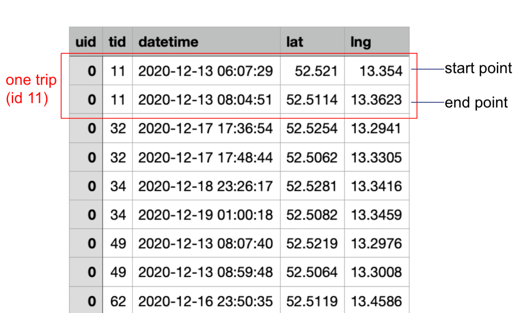 The input data format is expected as follows: a pandas DataFrame with the columns user id (uid), trip id (tid), timestamp (datetime), latitude (lat), and longitude (lng). Only staypoints, i.e., start and destination, are considered. If the dataset set also contains waypoints for a trip, they will not be evaluated in the report.